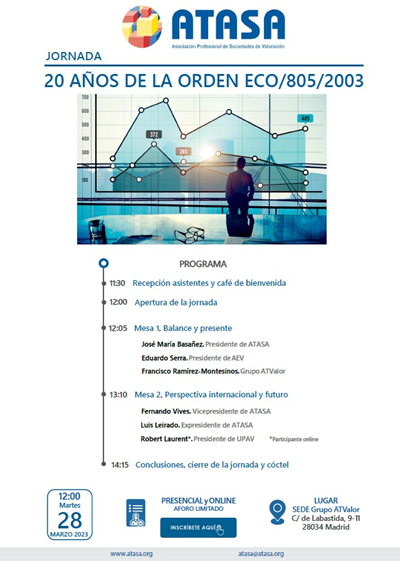 Tenemos el placer de anunciar que Grupo ATValor acogerá el próximo 28 de Marzo, en sus oficinas de la C/ Labastida nº11, la jornada “20 años de la Orden ECO/805/2003” organizada por ATASA (Asociación Profesional de Sociedades de Valoración) y con la colaboración de GRUPO ATValor.